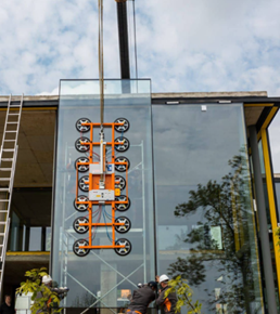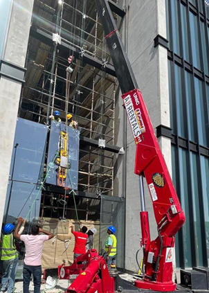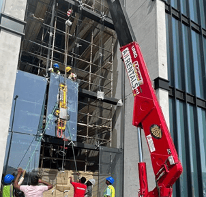 Expert handling and installation of large-scale jumbo glass panels with high accuracy and specialized lifting systems.